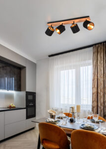 Modern kitchen combined with the dining room in dark and light colors, with orange chairs and glass cabinets for dishes